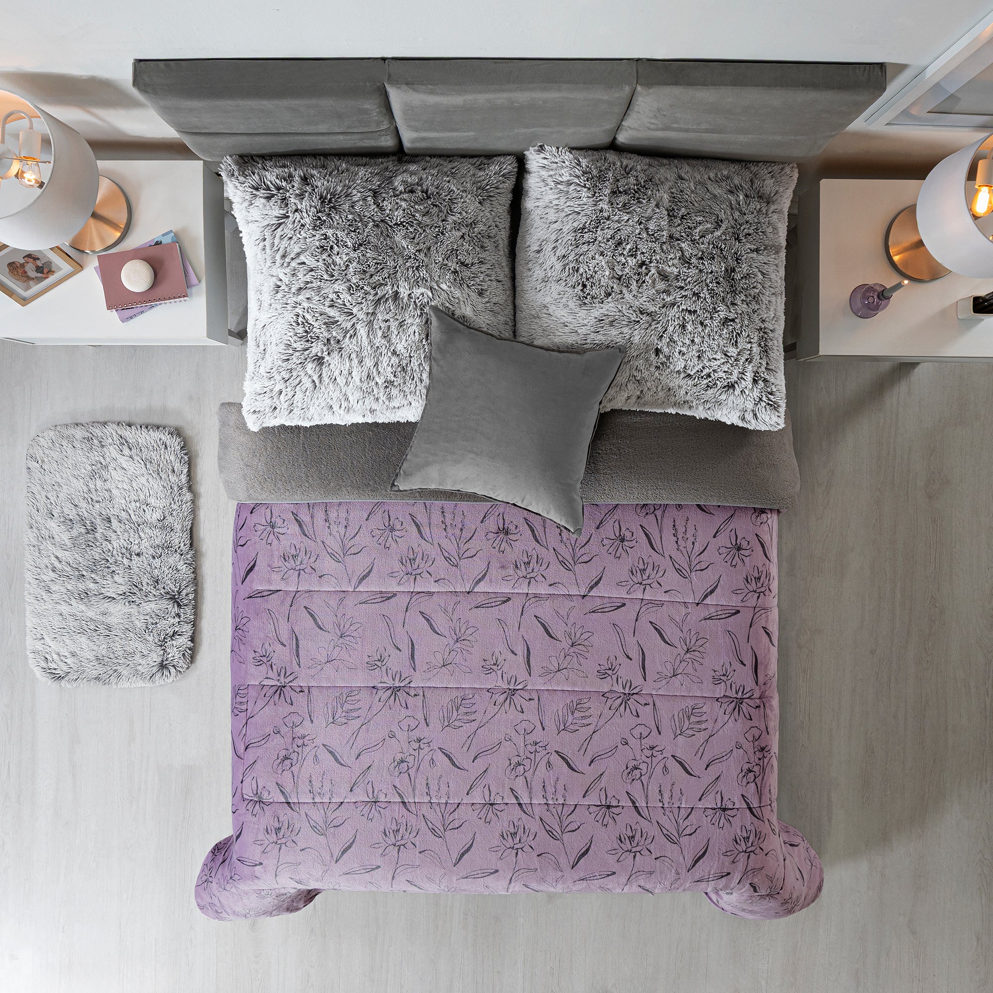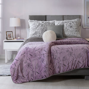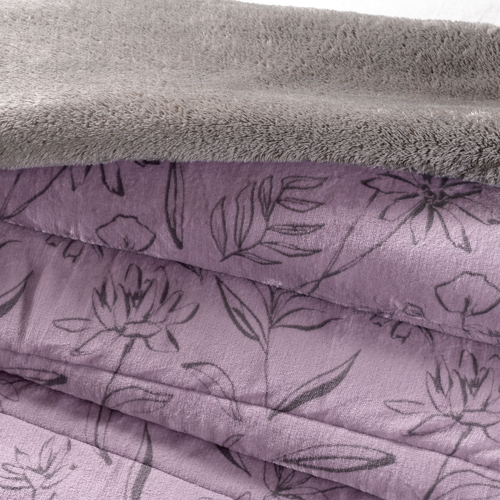 Cobertor invernal con primera vista de textura suave Beauty Soft y su segunda vista de borrega premium. Su encantador tono lila complementado con un delicado motivo de flores en contorno lo hace ideal para cualquier edad.